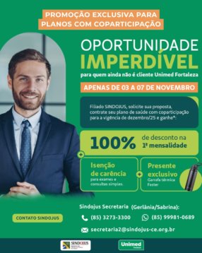 Sindicalizados(as) podem aderir à Unimed Fortaleza com 100% de desconto na primeira mensalidade em planos com coparticipação até 21 de novembro