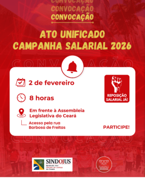 Sem definição do Governo do Estado sobre o índice de reajuste aos servidores públicos estaduais, o Sindicato dos Oficiais de Justiça do Ceará convoca as oficiais e os oficiais de Justiça de todo o Estado para o Ato Unificado da campanha salarial 2026. A mobilização será realizada no dia 2 de fevereiro, às 8 horas, em frente à Assembleia Legislativa do Estado do Ceará (Alece), conforme deliberação do Fórum Unificado das Associações e Sindicatos dos Servidores Públicos Estaduais do Ceará (Fuaspec) em plenária realizada na última quinta-feira (15).