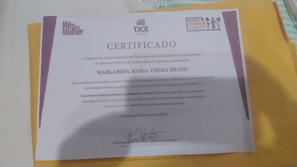 Margarida Brasil é motivo de orgulho para o Ceará e toda a categoria. A sua presença naquela função até então ocupada exclusivamente por homens representou um marco e abriu caminho para que muitas outras pudessem ingressar na carreira. A diretora dos Aposentados do Sindojus reforça que ser Oficiala de Justiça é motivo de orgulho. Significa estar na linha de frente do Poder Judiciário, mas é também agir com empatia, mediar conflitos com firmeza e sensibilidade, e provar, todos os dias, que preparo, equilíbrio e responsabilidade não têm gênero.
